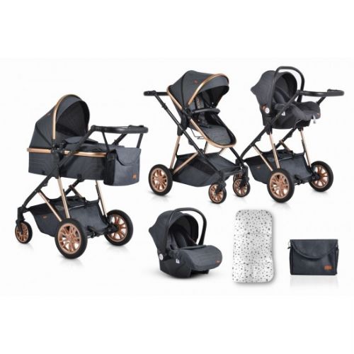 Telaio in alluminio leggero. Unità di seduta completamente reversibile, Può essere trasformato in navicella per neonati fino a 6 mesi e in seggiolino per bambini dai 6 ai 36 mesi. Manubrio regolabile in altezza. Unità sedile reclinabile a tre posizioni. Poggiapiedi regolabile in due posizioni. Copripiedi incluso. Sistema di imbracatura a cinque punti con spalline morbide. Barra paraurti regolabile e rimovibile. Freno one-touch. Ampio cestello di stoccaggio. Piegatura rapida e compatta. Accessori, inclusi nel set: seggiolino auto (Gruppo 0, 0-13 kg), 2 materassini, copripiedi e borsa mamma.