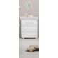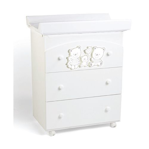 Bagnetto 3 cassetti con top con angoli sagomati e bordati in gomma antiurto. Cerniera di apertura top con sistema di rallentamento di sicurezza. Pomelli in legno tinto bianco.