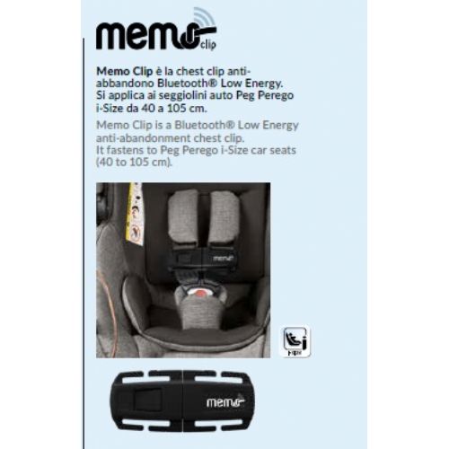 Memo Clip è compatibile con tutti i seggiolini auto i-Size Peg Perego, da 40 a 105 cm.VAI A MEMO CLIP »L'app Memo Peg Perego: