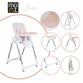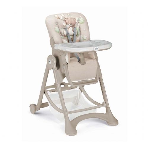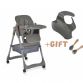 6 altezze, 4 inclinazioni dello schienale, movimento sincronizzato di schienale e poggiapiedi, 3 tavolette regolabili e removibili, vani portaposate, morbida imbottitura, cinghia a 5 punti, ruote posteriori con freno, capiente cestino. Si pulisce facilmente con una spugnetta. Super compatto, chiuso sta in piedi da solo. Si utilizza facilmente con una sola mano.