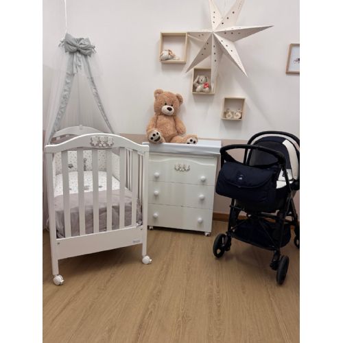 Lettino completo di materasso piumone paracolpi federa, sponde regolabili doppia altezza di rete cassetto